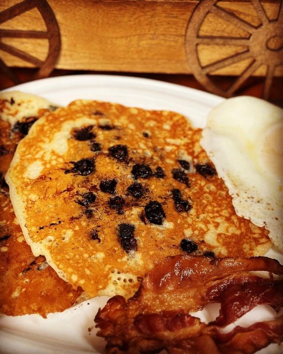 Two large fluffy pancake with choice of (blueberries, chocolate chips, banana or strawberries)