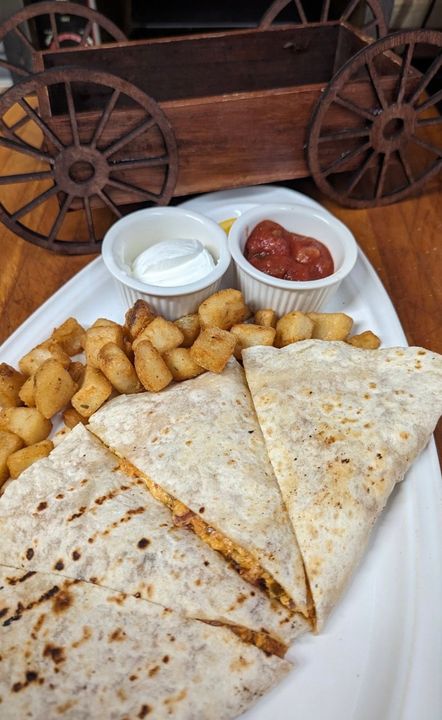 3 eggs, peppers, onions, tomatoes, mushrooms, broccoli, spinach, salsa, cheddar cheese in a flour tortilla. Sour cream, salsa side. Home fries