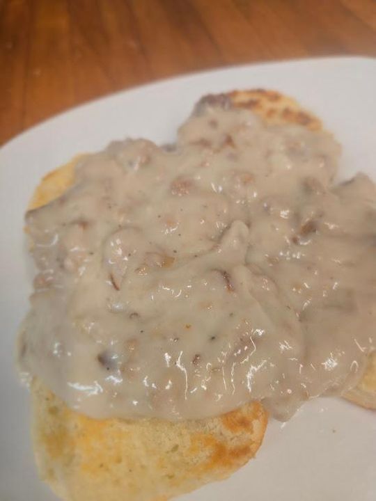 Two eggs any style, two biscuits topped with sausage gravy & choice of home fries or grits