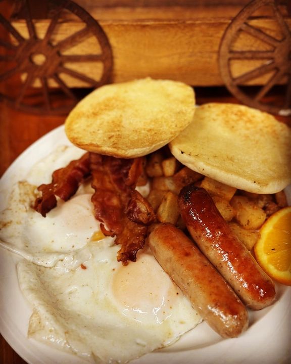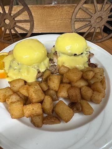 2 eggs any style & choice of bacon, ham, sausage, Canadian bacon .50 or turkey bacon .50. Home fries & choice of bread
