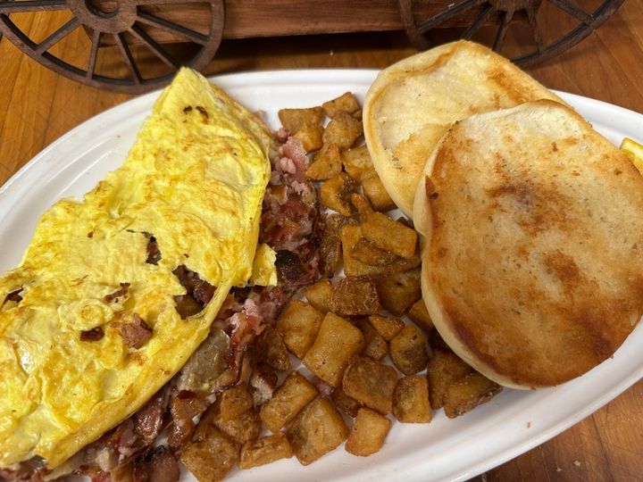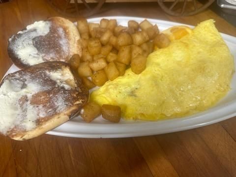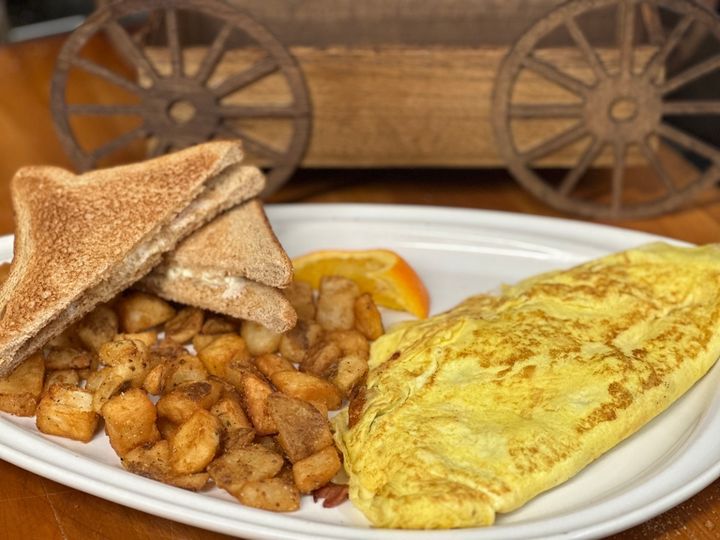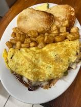 Plain omelet no cheese. Add-in: ham, sausage, bacon, Canadian bacon, turkey bacon, tomatoes, onions, mushrooms, spinach, peppers, corned beef hash $3, chili $3 or lox $7.99