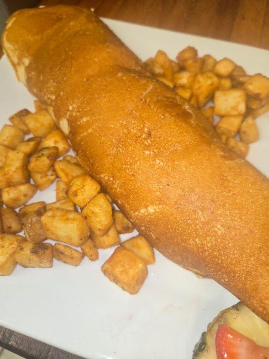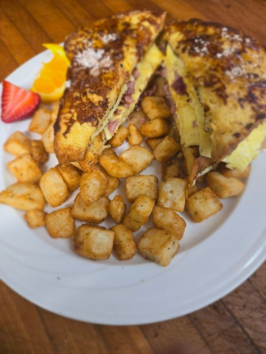 Challah French toast sandwich piled high with 2 eggs, ham & Swiss cheese. Syrup drizzle & sprinkled with powdered cinnamon sugar. Home fries