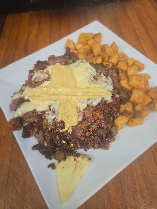 Corn beef hash on rye toast topped with sauteed mushrooms, onions and melted cheese and spicy mustard. $16.25