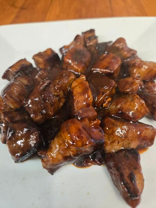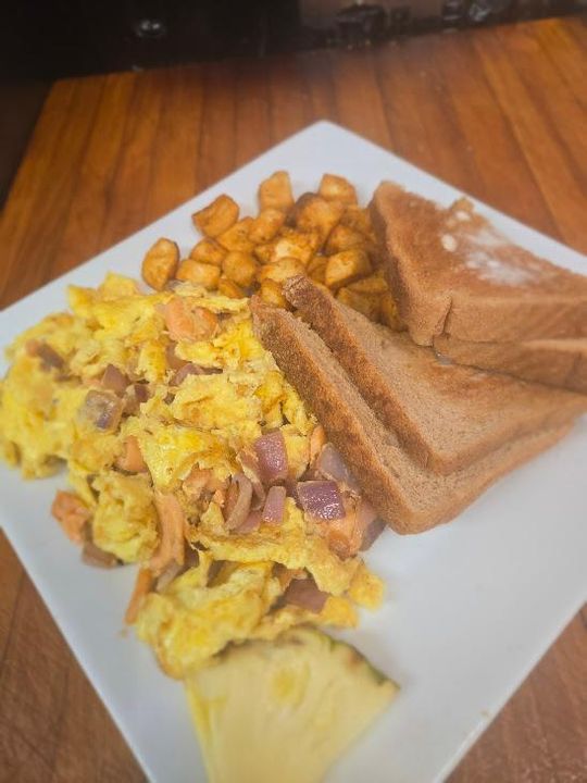 3 eggs any style & BBQ steak tips. Home fries & choice of bread