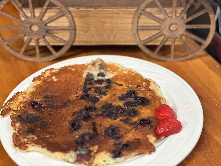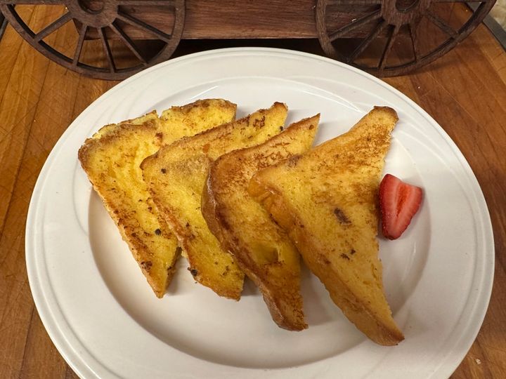 Two slices of Challah bread hand-dipped in our cinnamon egg batter. Prepared Plain, or choice of fresh Blueberry, fresh Strawberry, Banana, or Chocolate Chips