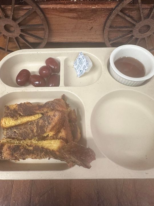 6 slices of challah french toast sticks served with warm syrup and grapes