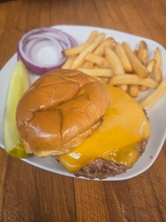 ½ lb. of beef burger, your choice of cheese on a grilled brioche bun lettuce, tomato & onions Add: Bacon, Peppers, Mushrooms & Grilled Onion extra charge Cheeses: American, Cheddar, Swiss or Provolone