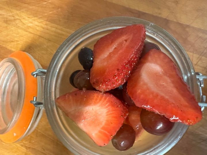 Small portion of seasonal fresh fruit cut daily including melons and berries
