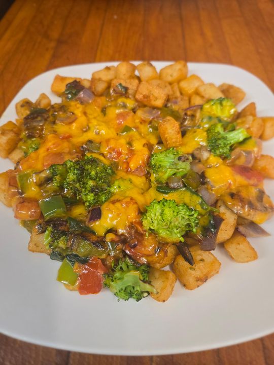 Homefries, spinach, brocolli, peppers, onions, mushrooms and tomatoes with melted cheddar cheese